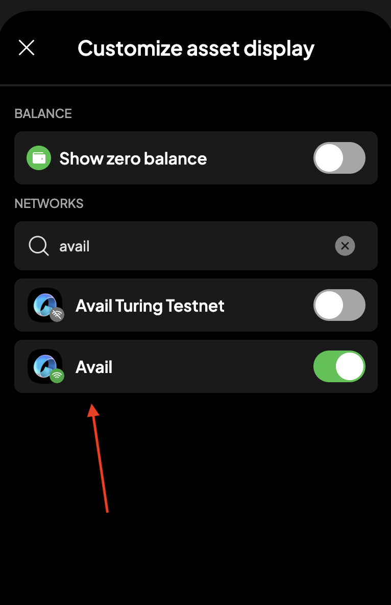 - Search for Avail testnets either by name or by token symbol. Make sure the network is toggled on.