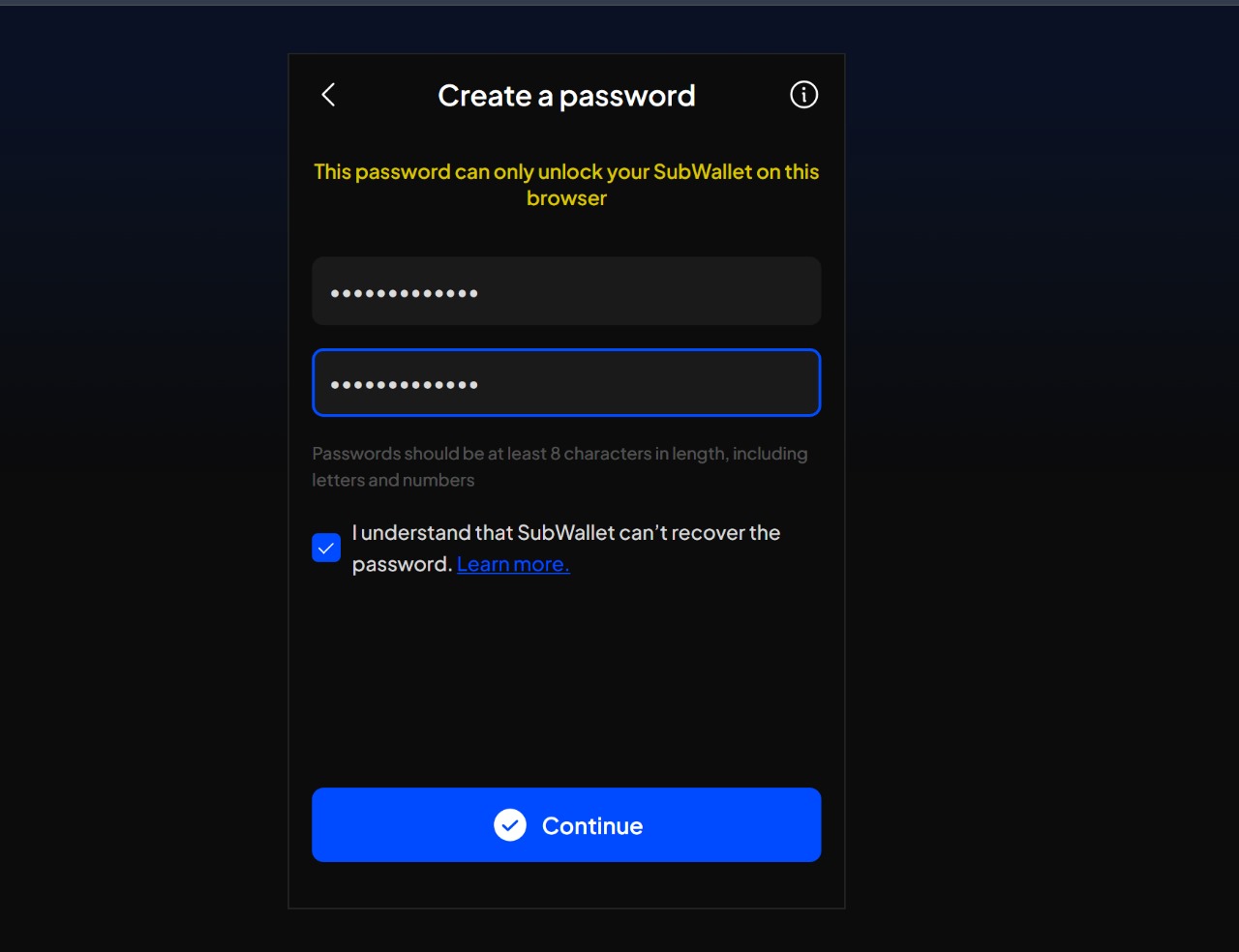 - Subwallet will prompt you to set up a password to secure access to the accounts in the wallet. Please note that this password DOES NOT control the actual on-chain account, and is merely used to open the wallet extension.