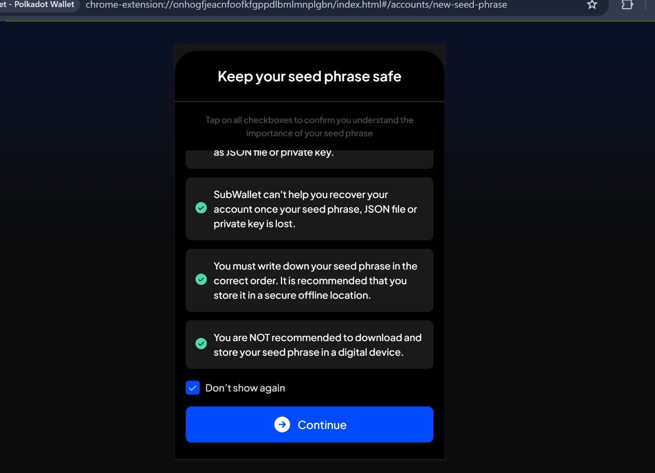 - You will be shown your seed phrase. Make sure to write it down and store it in a safe place.