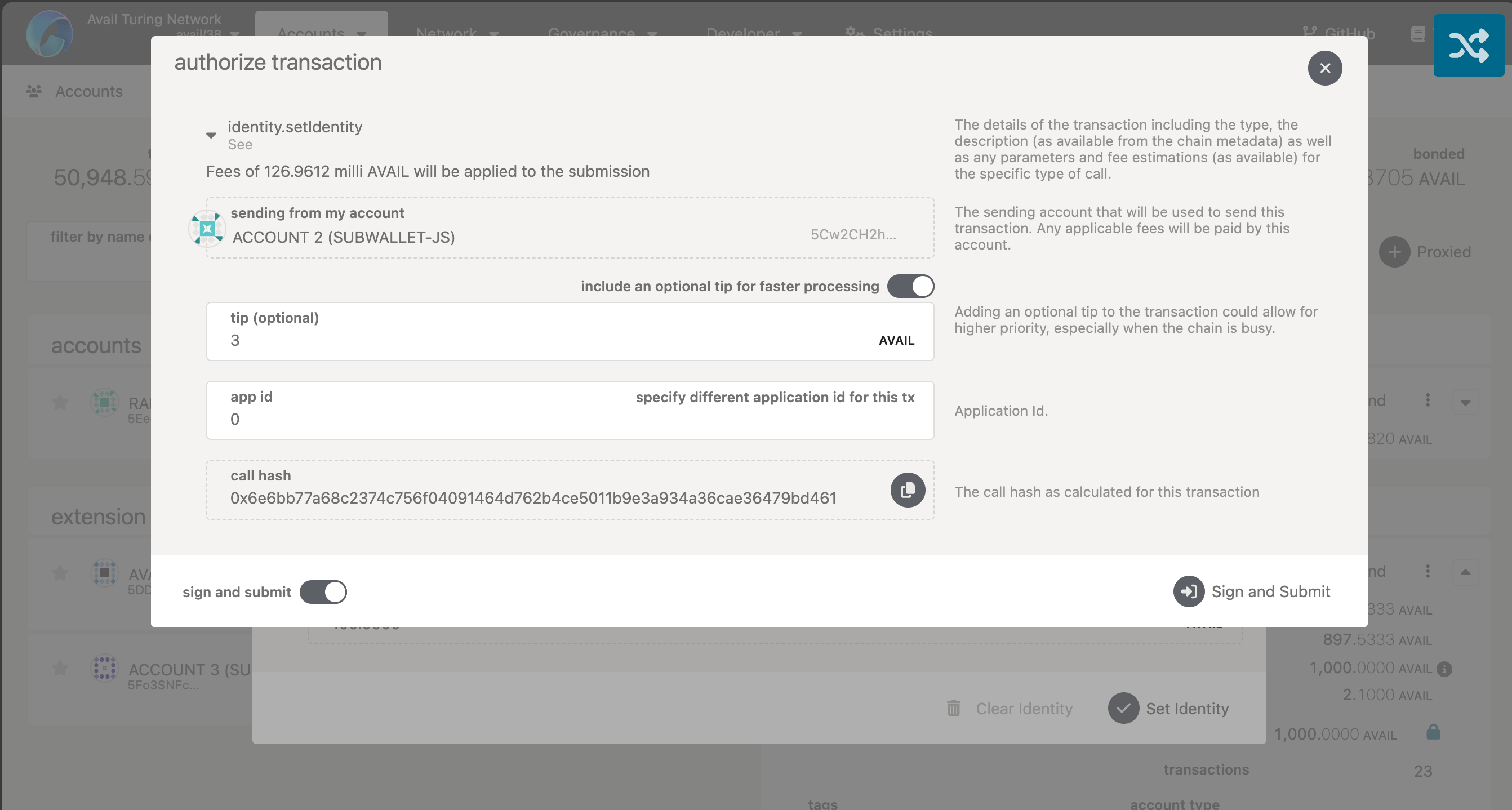 AVAILto set an identity, which is refunded if and when the identity is cleared. - The bond amount for registering an on-chain identity is currently 100 AVAIL.